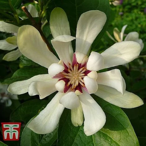 - Calycanthus ‘Venus’ – Produces extremely fragrant, magnolia-like flowers with white strap-like petals in May. Height: 1.8m (6′). Spread: 1.5m (5′).