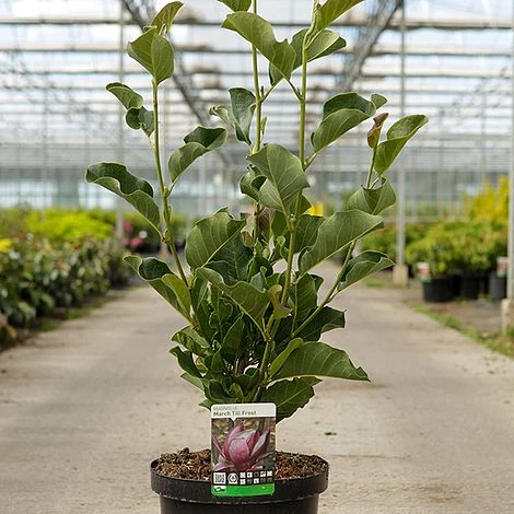 If you love magnolias but wish they didn’t have such as short season, this is the perfect variety for you. Magnolia ‘March Till Frost’ fulfils its name, delivering masses of blooms in March/April and then continuously producing sporadic bursts of flowers until the first autumn frosts. A liliflora type, the upright flowers don’t open completely, forming elegant, tulip-shaped blooms that change colour as the season progresses. The first flowers are pale pink, the later ones deepening in colour to carmine. The inner colour of the tepals is rose-pink to white, forming a striking contrast with the darker exterior. The flowers are followed by erect, candle-like, magenta seed pods that contrast beautifully with the foliage, adding a second season of interest. Magnolia ‘March Till Frost’ forms a small, upright, well-branching tree with glossy, dark green leaves. It makes a stunning deciduous shrub or tree for a small to medium garden. Height and spread: 2- 5m (6.5-16ft).