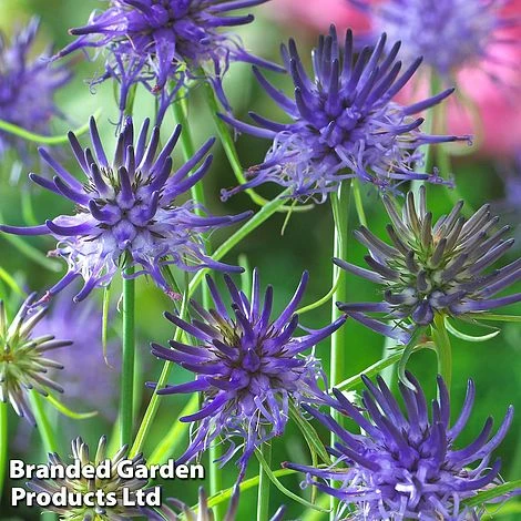 More commonly found in mountain meadows in the Alps than in British gardens, Phyteuma scheuchzeri is a striking and quirky alpine boasting distinctive horned flowerheads in vivid purple-blue. The unusual flowerheads are borne on upright stems above a basal clump of narrow, pointed semi-evergreen foliage. Loved by bees, horned rampion is great for wildlife gardens and the front of borders; or grow in a rockery or container to allow close inspection of its fascinating blooms! Height: 35cm (14in). Spread: 30cm (12in).
