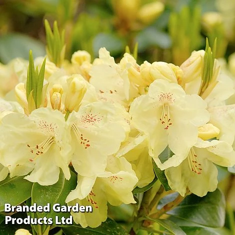 Yakushimanum hybrids are a group of semi-dwarf Rhododendrons that are perfect for containers and small gardens. They are renowned for their vigour and floriferous character, bearing big, showy blooms from May to early June on compact, bushy plants with dense rich evergreen foliage. Rhododendron ‘Centennial Gold’ bears funnel-shaped flowers in a soft primrose yellow with speckled throats, the pale blooms standing out beautifully against the dark green leaves. Disease-tolerant and low maintenance, it provides a spectacular display early in the year for very little effort. Height: 1m (39in). Spread: 75cm (30in).