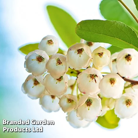 Long, graceful arching stems are covered in blooms throughout the summer months with this lovely, semi evergreen, hardy shrub. Zenobia pulverulenta ‘Blue Sky’ , sometimes referred to as “honey-cup”, produces racemes of delicate hanging cup-shaped flowers in white along the length of the new stems during summer, which stand out beautifully against the green leaves and new, reddish-brown of the new growth too. An impressive shrub for growing at the back of a flower border or as a feature plant in any shrub border. Height: 200cm (78″). Spread: 150cm (59″).